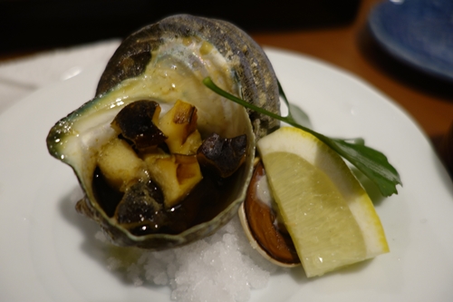 お刺身の盛り合わせを注文して待っていると、、背中に気配が、、振り向くと、、、うわ!まじですか!ものすごい豪華な盛り合わせが!こんな器みたことないです!いただいてみると、、、うん!おいしい〜!鮮度もいいですね〜!