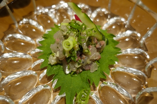 ここで日本酒をいただきながら、何かあてが欲しいなということでアジのなめろうをお願いしました!活きアジをさばいたばっかりのなめろうですからね〜!すばらしい!