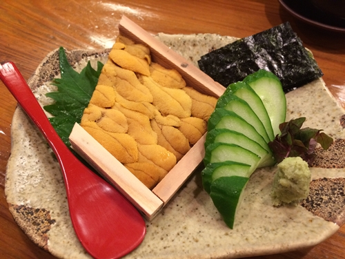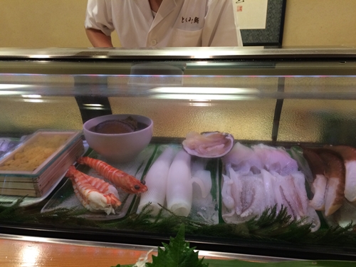 まずは温かいお茶をすすりながら今日は何をいただこうかな〜とショーケースを見ていると先日は入荷がなかった生ウニがありました〜!お刺身の盛り合わせと一緒に生ウニもお願いしてみました〜!