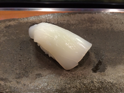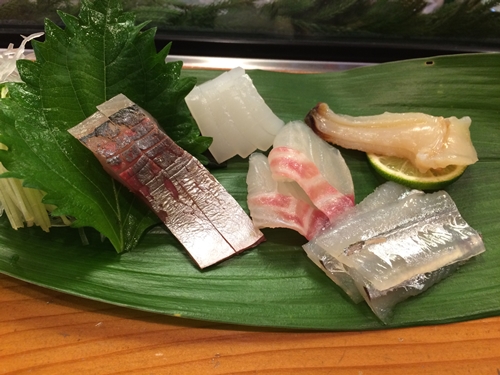 つづいてイカが登場しました!私の大好物ですね〜!今度は白身が登場!アジと鯛ですね!〜鯛も鮮度がよくっておいしい〜!アジも最高ですね!