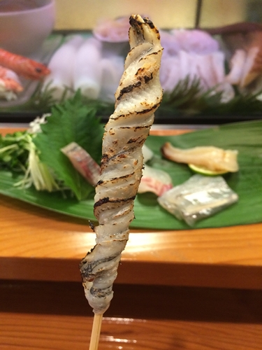 つづいて、大将から焼きものを手渡されました。なんだろう、、あっ!こ、これは!そうなんです!サヨリの皮の炙りなんですよ〜!サヨリの皮をあなどることなかれ!これが超絶においしいのですから〜!いただくと、、、超おいしいです!たまりませんね〜!