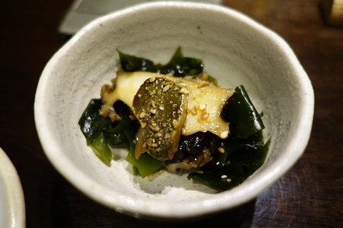 さて、先日ちょっと間があいていたのですがこちらのお店にお邪魔してきました!鉄板焼きのしんごさんです。何か秋の味覚はないかな〜と思いながらの訪問です。まずは生ビールで乾杯させてもらいました〜!つきだしはなんとあわび!ありがたいですね〜!
