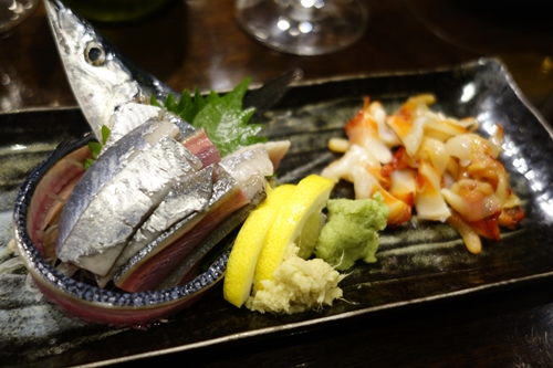 つづいてお刺身をお願いしました〜!なんとさんまがありました!秋の味覚ですね〜!一緒に夜鳴き貝をお願いしました!しっかり脂がのっているさんまが超おいしかったです!よなきも最高でした!