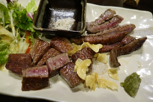 白ワインがおいしくってもう一本お願いしちゃいました〜!ここでお肉をいただきます!A5ランクのヒレといちぼがあったので半分半分でお願いしました!そういうこともできますよ〜!登場したお肉がこれまたおいしそう!まずはいちぼからいただきました!おいしい〜!なんにもつけなくてもとってもおいしい〜!ヒレをいただくとこれまたおいしい〜!これほんとにヒレなのって思ってしまうほど脂がのっていました!