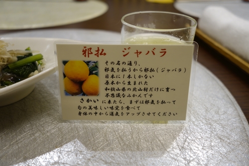 この日は二階の席に通していただき、いろいろとお料理を楽しませていただきました〜!まずは生ビールで乾杯させていただきました!先付はおひたしとジャバラという果物の果汁でした!邪気をはらってくれるそうです!