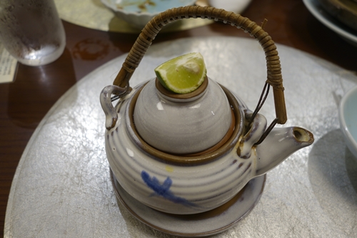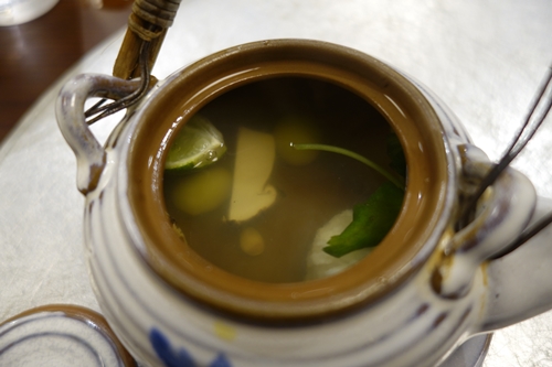最後はやっぱり土瓶蒸しを!今年初めていただく土瓶蒸し!熱燗と土瓶蒸しはよくあいますよね〜!まずはお出汁から!おおお!おいしいです〜!つづいて松茸を!香りがいいですね〜!