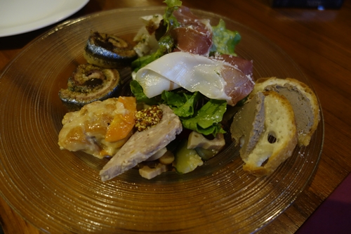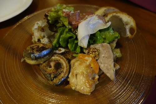 最初に前菜の盛り合わせのような感じでワンプレートが登場しました!これにはびっくり!ものすごく手がこんでいます!そしてボリュームもたっぷり!サンマ、生ハム、コンフィ、ピクルス、パテ、コチのカルパッチョ、、、どれだけ入っているだ〜〜〜!いただくと、、おいしい〜!どれもおいしい!これだけでおなかがいっぱいといいたくなるくらいすばらしいボリュームでした!
