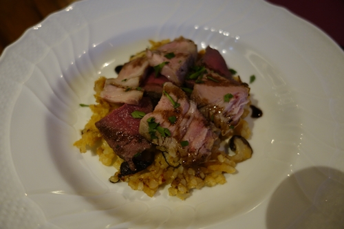 ここで牛肉と豚肉の焼きリゾットが登場です!これがものすごくおいしい!ワインにもあいますね〜!豚肉が特においしい!特別なお肉のようです!
