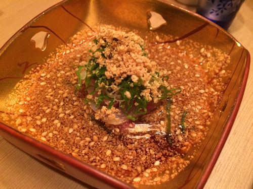 つづいてアジ胡麻!この絶妙の酸味と胡麻風味のタレが本当においしい〜!アジじゃなくてもどんなお魚でもあうのでお刺身と一緒に食べるようにお皿は残しておくことをおすすめします!