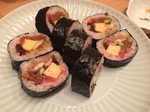 最後は何気なく巻きずしをお願いしました。登場した巻きずしをいただくと、、えええ!なんなんだ!このおいしさは!巻き加減がほわっとしているのに具をしっかりずっしり感じます!おいしい〜!隠し味があるような気がするくらいおいしい!