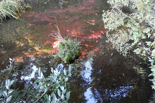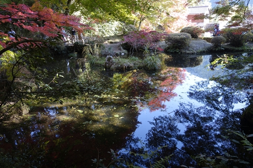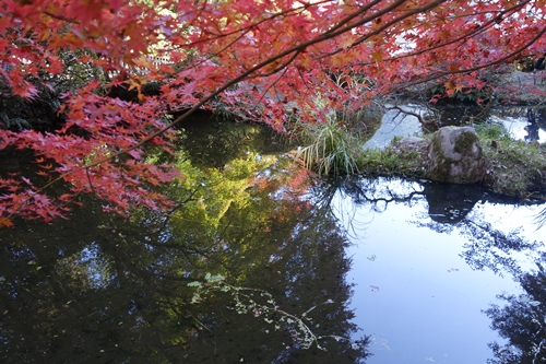 つづいて入口から吉水園に入ります!まずは池が出迎えてくれます。その池に7割ほど紅葉したもみじが映っていました!今週末ならもっと美しいでしょうね〜!