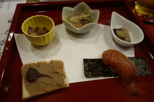 生ビールで乾杯した後に先付が登場しました!おいしそう!ふと見るとなんとマグロの赤身の漬けのにぎりが!おいしい〜!パテもおいしい、なまこもおいしい!どれも本当においしい!大将が手間暇かけていらっしゃる姿が目に浮かびます。