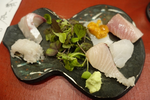お刺身が登場しました!朝釣れて〆めたばかりの天然鯛とアナゴ!こちらは醤油なしでわさびだけでいただきます。おいしい〜!アナゴのお刺身ってなかなか食べる機会がないので新鮮ですね〜!イカ、さわら、まぐろ、そして、、、なんとクエ!10日間熟成させてあるクエが登場しました!くぅ〜!おいしいです〜!