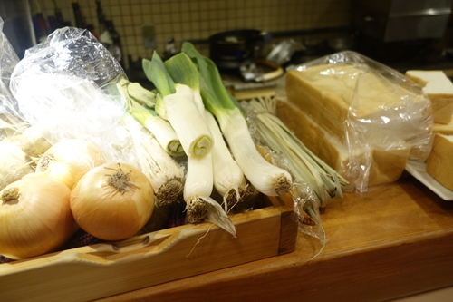 お店に入ると大将が迎えてくださいました〜!一度しか伺っていないのにちゃんと覚えておいてくださいました!うれしいですね〜!カウンターにはネギやたまねぎ、そして食パンなどの食材が!これだけみると和食にはみえないですよね。洋食屋さんかなと。そこがむら上さんの楽しいところなんですよね〜!