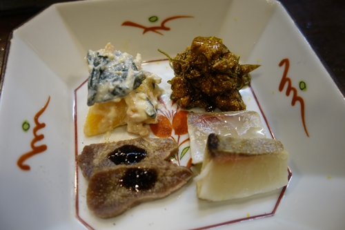 ということで今週のえび一さんは?のコーナーがやってまいりました。熱燗をいただきながら、先付をいただきます。大好物の柿の白和えが入っていました。最初にいただいたときに柿ってこういう風に食べれるんだ〜ってびっくりしたことをいまだに覚えております。魚の子も入っていました!お正月を感じますね〜!おいしいですよ〜!