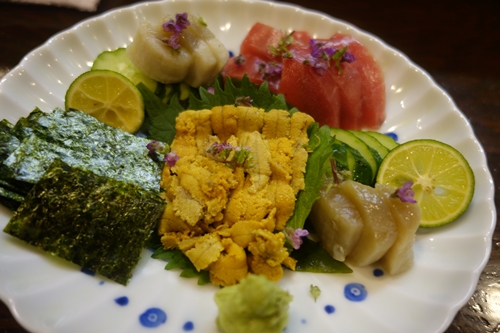 つづいてお刺身をお願いしました!この日は本マグロにたいらぎ貝に生ウニ!見てください!この輝きを放つかのような一皿を!真ん中にどど〜んと黄金に輝く生うにが!この時期になってくるとさらにウニが濃厚になってくるように感じるのは気のせいなのかな〜。いただいてみると、、おいしい〜!海苔に巻いてもう一度いただいてみると、、さらにおいしい〜!最高です〜!