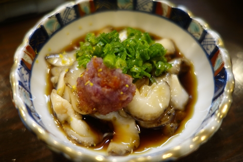 ここで体もあったまってきたのでナマコポン酢をいただきながら、冷酒をいただくことに!標高700Mの蔵でつくっている神雷さんです!おいしいですね〜!