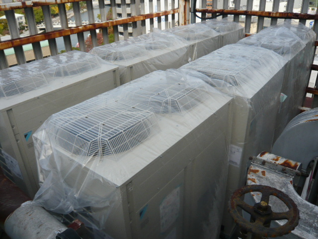 昨日、大型クレーン車で旧型の空調機を1台撤去したことを