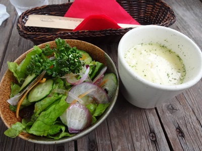 私はタンシチューをお願いしました!まわりの緑を堪能しながらの食事は格別ですね!まずはスープとサラダが登場しました!