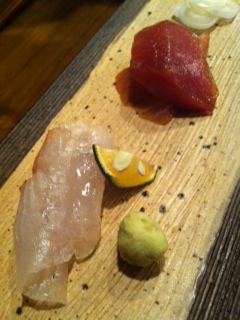 メニューをみると、、、天然ブリづけを辛子で というメニューがありました。天然ブリ〜〜!今年に入ってブリはまだ食べていません。これはうれしい〜〜〜!ということで天然ひらめ昆布〆と一緒にいただきました〜!