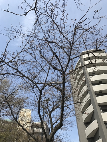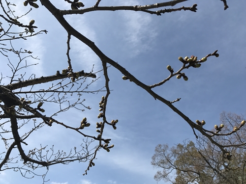 他の桜の木もみてまわりましたが、まったく咲いていません。でもつぼみはすでにピンク色になっています。つぼみが日に日にふくらんでいっているのがわかりますね〜。