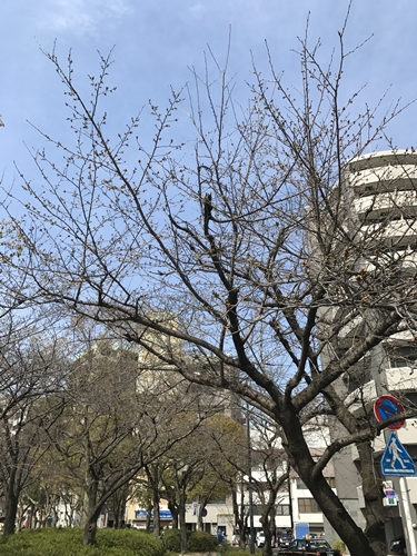 あいにくの空模様なのでちょっと写真がみにくいのですが、平和公園の中で一番先に咲く桜の木では数輪また開花ししていましたよ〜!今日が少し気温が低いので桜の開花に若干影響がありそうですが明日はかなり暖かくなるので開花がすすみそうですね〜!