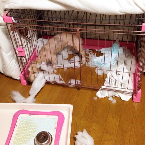 吠えるのでご近所の方に迷惑かと、布団を被せて行ったのですが、中の綿が出てグシャグシャだし、なぜかこのサークルから出ていて部屋を荒らしていたり(´;ω;`)