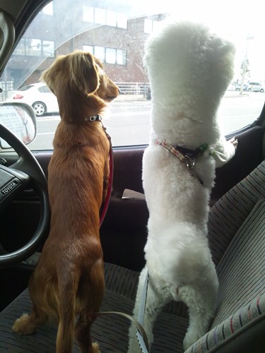 病院に一泊だったので、もう一頭のビションフリーゼのウーマロ君(雄)とバスに乗って少しフラフラしてみました。