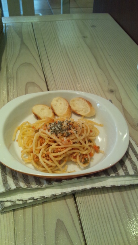 ルビーには、こちらのパスタと、お野菜たっぷりケークサレを頼みました。美味しそうに食べました〜。