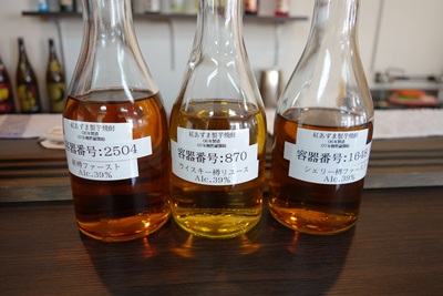 おやウィスキー?実はこちら中国醸造さんがお持ちのウィスキー樽やシェリー樽に6年ほどこの焼酎をねかせたものなんです。樽によって色も味わいも違うようです。ためしにいただいてみました。