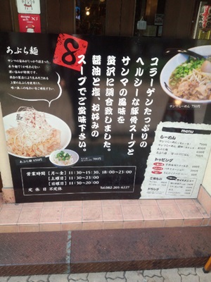 ということで、ちょっとお散歩にでかけることに。ちょっと銀山町のほうまでお散歩してみようとおもっててくてく歩いていると、、、なんだかおなかが減ったな〜と。ふと時計を見ると13時過ぎていました。そういえばお昼ご飯を食べ損ねていたんだ、、、、ひとまず汁なし担担麺でも食べようと本通り商店街から八丁堀へ抜けようとしたとき、、、目の前にラーメン屋さんが。