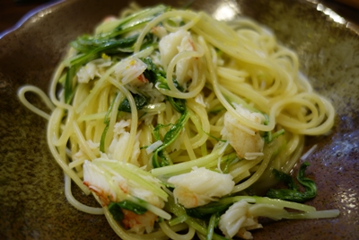 そして最後は、、、最近はずせなくなった、、、パスタ!今回はオイル系です!かにとクレソンがたっぷり入ったパスタを作っていただきました!もう、、、癖になっちゃいました!