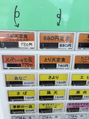 まずは食券を買います!680円定食や880円定食が一般的だと思うんですが、この日はえび天定食とあなご天定食にしてみました!初めてのトライです!