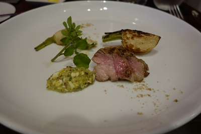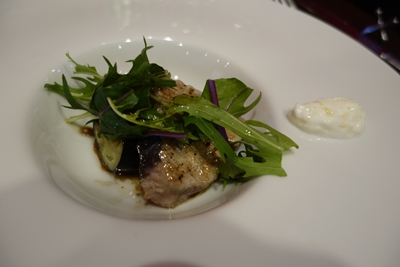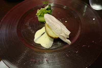 まずはホロホロ鳥が登場しました!46度だったかな、低温でじっくりと仕上げたんだそうです。お皿のふちには赤ワインでつくったお塩が!もうめちゃめちゃおいしい〜!フレンチってあんまりよくわからないんですが、ほんとおいしい!すごいです!