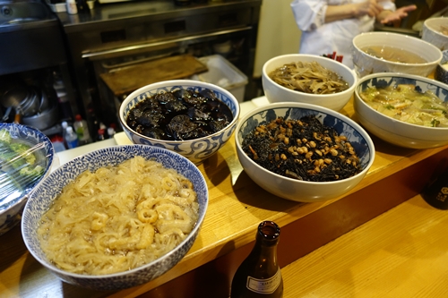 お店に入るとお母さんがいつもの感じで迎えてくださいました〜!いつもながらお元気そうで安心しました!カウンターにはたくさんの手料理が並んでいます。どれもおいしそうですね〜!