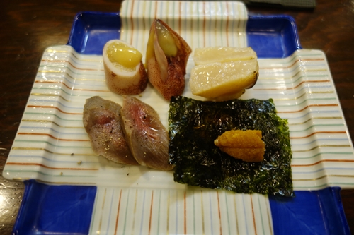 つづいて先付は子持ちのイカとホタテ、タンと蒸したウニでした!どれも絶品ですね〜!本当においしい!すばらしいです!