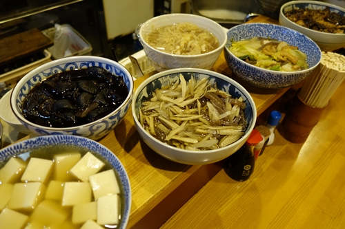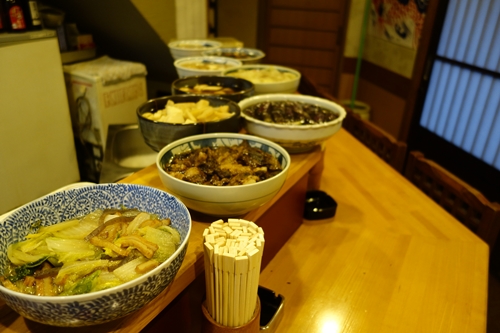 さて、まずはアサヒの瓶ビールからいただきます!瓶ビールでいただくってのがいいですよね〜!カウンターの上にはたくさんのお料理がならんでいます。この中から好きな料理を選んでいきますよ〜!といってもいつもだいたい決まっていますけどね!