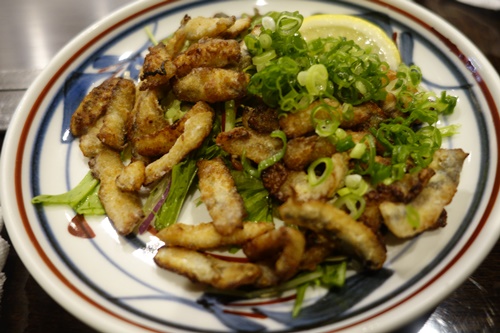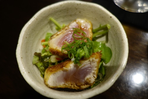 まずはハートランドの生をいただきます!先付はまぐろのパン粉焼き!おいしいですよ〜!